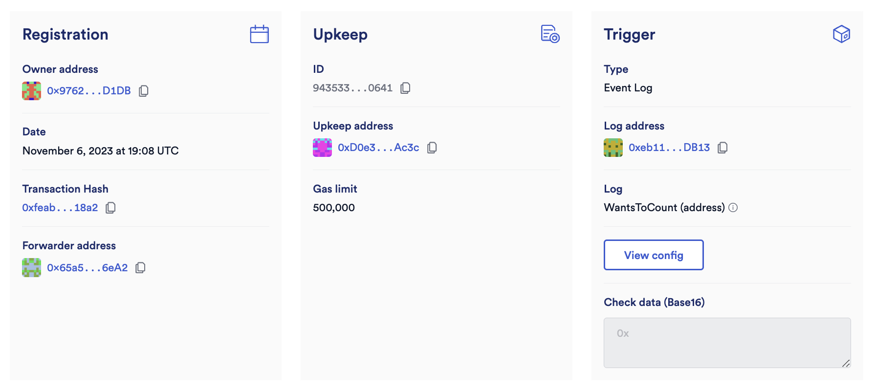 Click Register upkeep and confirm the transaction in MetaMask. Upkeep Registration Success Message