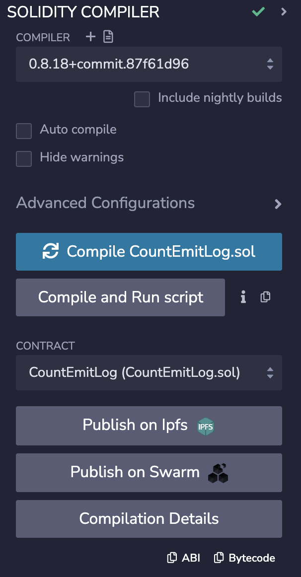 1. Open CountEmitLog.sol in Remix. This contract contains an event WantsToCount that keeps track of the address of the message sender. The function emitCountLog emits this event.