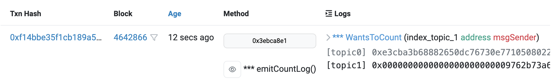5. Click Write Contract and click the emitCountLog button to emit a log.